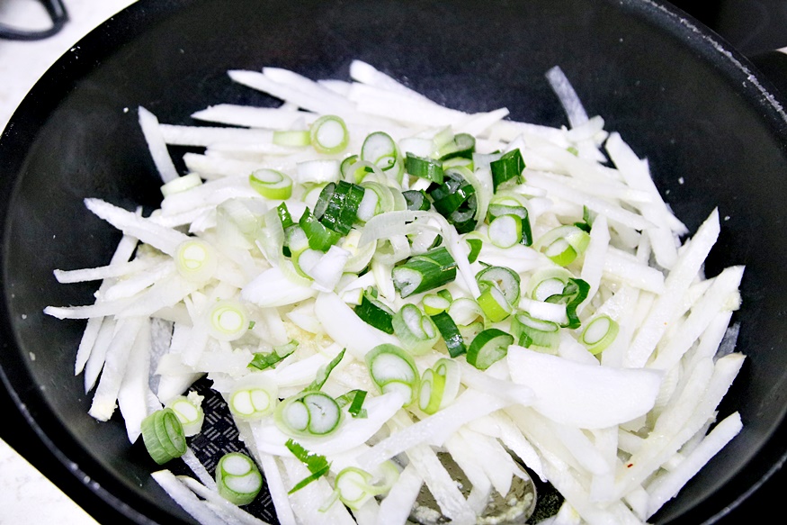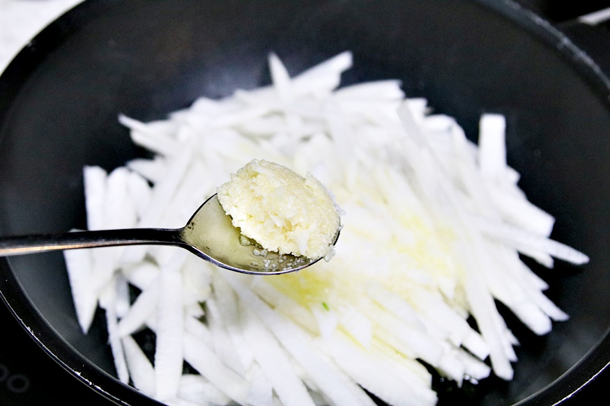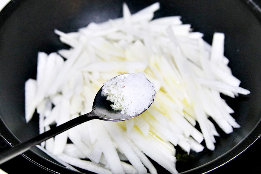 채 썬 무를 팬에 넣고 들기름과 소금을 넣고 고루 볶아 주세요