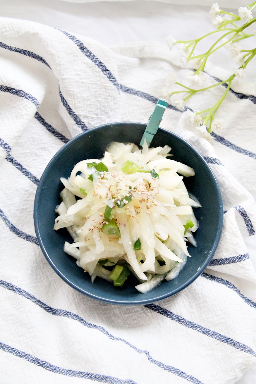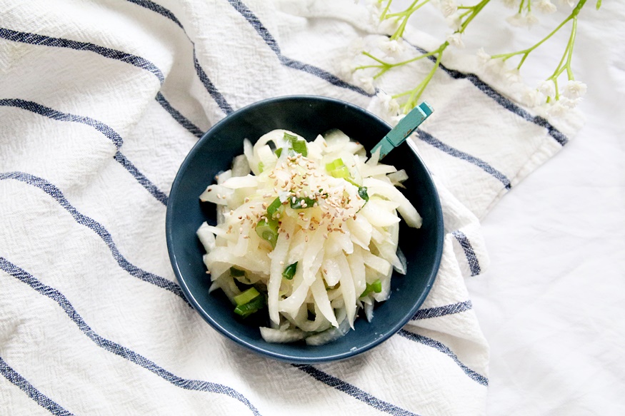 무 1/2, 소금 1/3큰술, 대파 1대, 간 마늘 1큰술, 매실액 2큰술