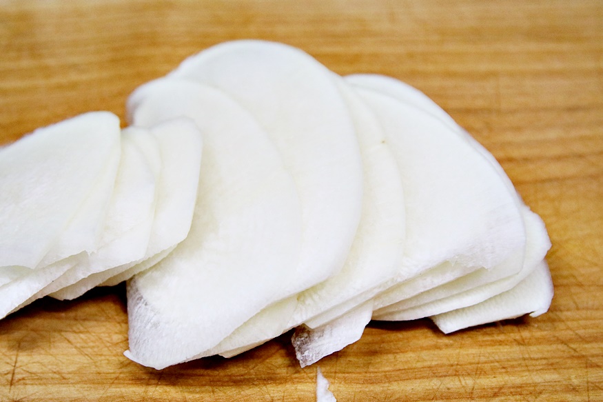 무는 너무 도톰하지 않게 썰어 채 썰어 주세요